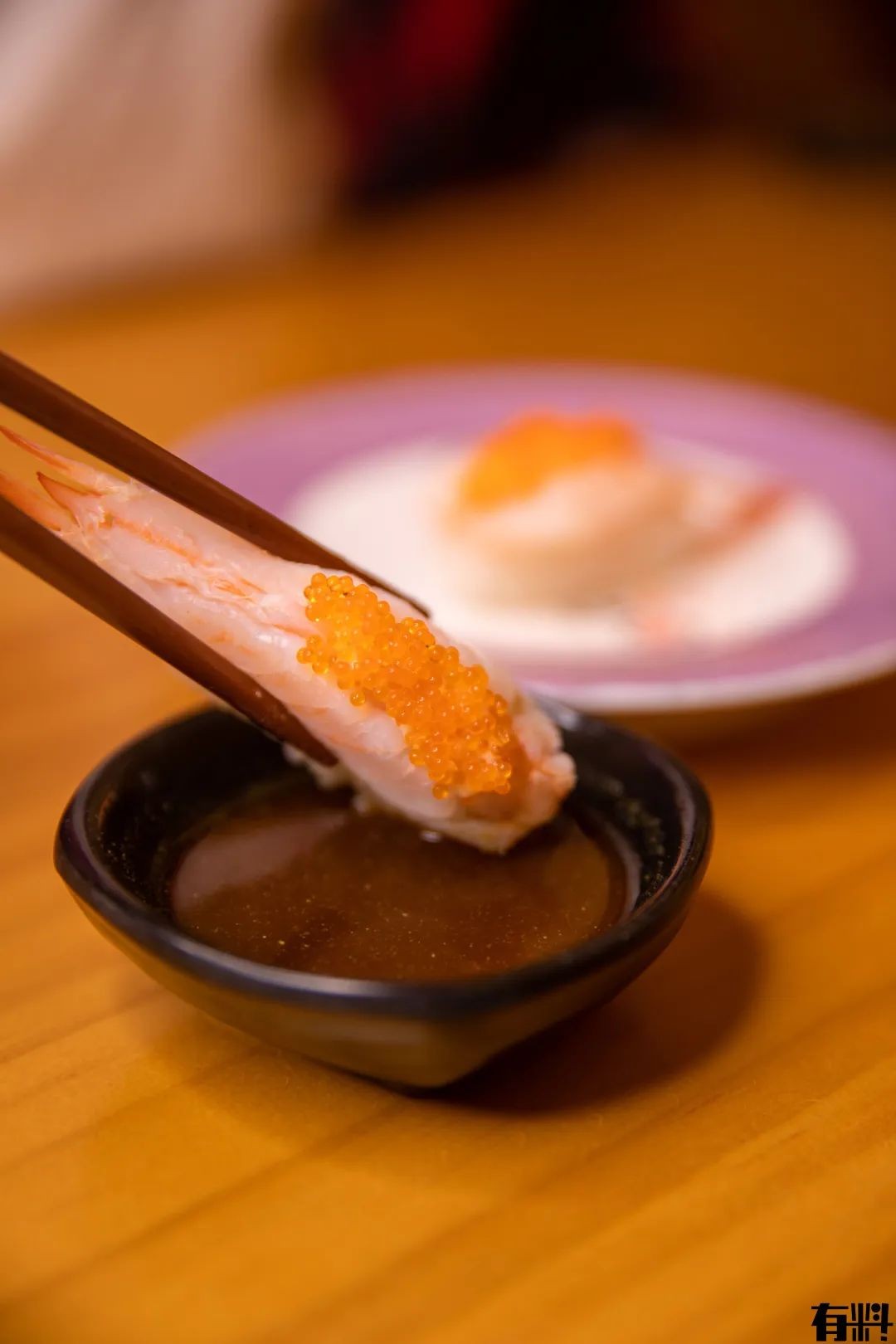 富贵虾寿司也是经典,鲜嫩的虾,碰上颗颗鱼籽,一口下去,重重鲜味环绕齿间。