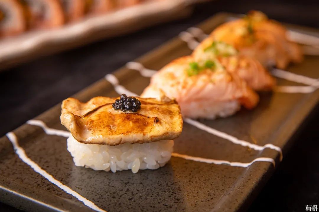 现点现做的火焰鹅肝寿司,鹅肝肉质鲜美,流出来的肉汁不要太香!