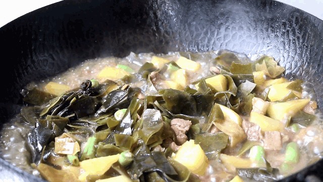4.五花肉炖好后再依次下入海带,土豆,豆角(时令蔬菜)炖煮5分钟让蔬菜充分的吸收猪肉的味道;这样炖出来的菜吃的才有味道;