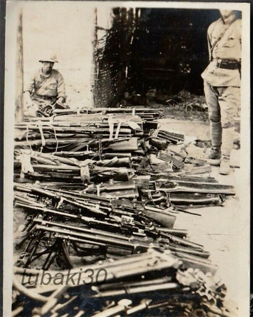 (21)侵华日军拍摄的缴获中国军队武器装备和俘虏的照片。时间地点不详。