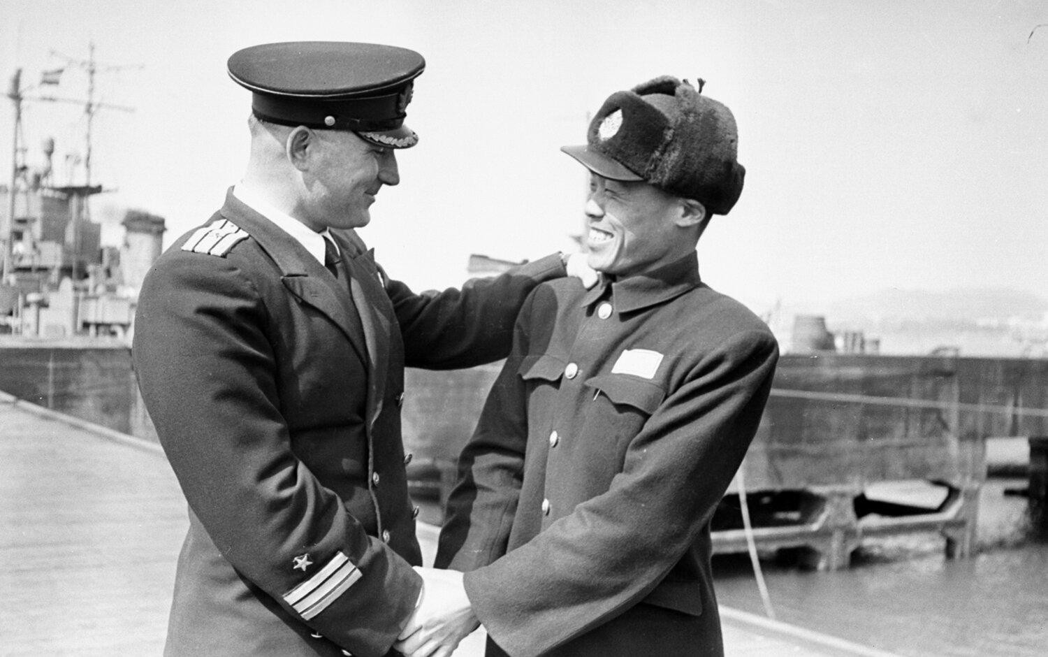 (33)1954至1955,旅顺港。苏军海军向中国海军交接海港和军舰。包括培训中国海军。这个任务由苏军海军水兵一对一,手把手地教授完成。这组图记录了在告别时刻中苏海军战士之间依依惜别的难忘场面。