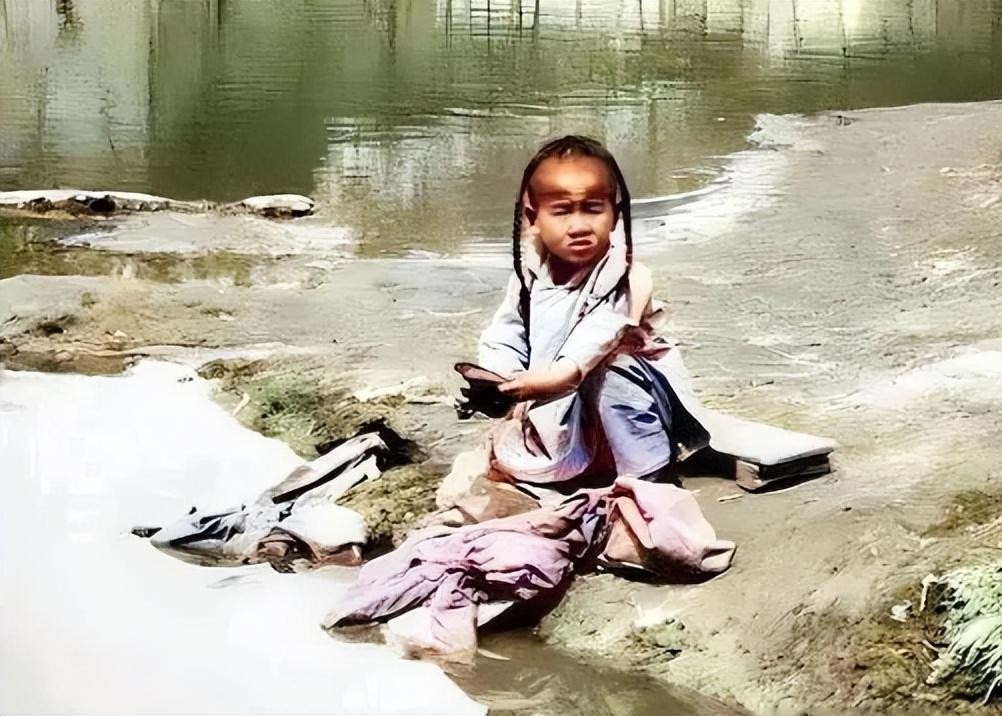 (15)一名童养媳洗衣服,小小年纪面前摆着一大堆衣服