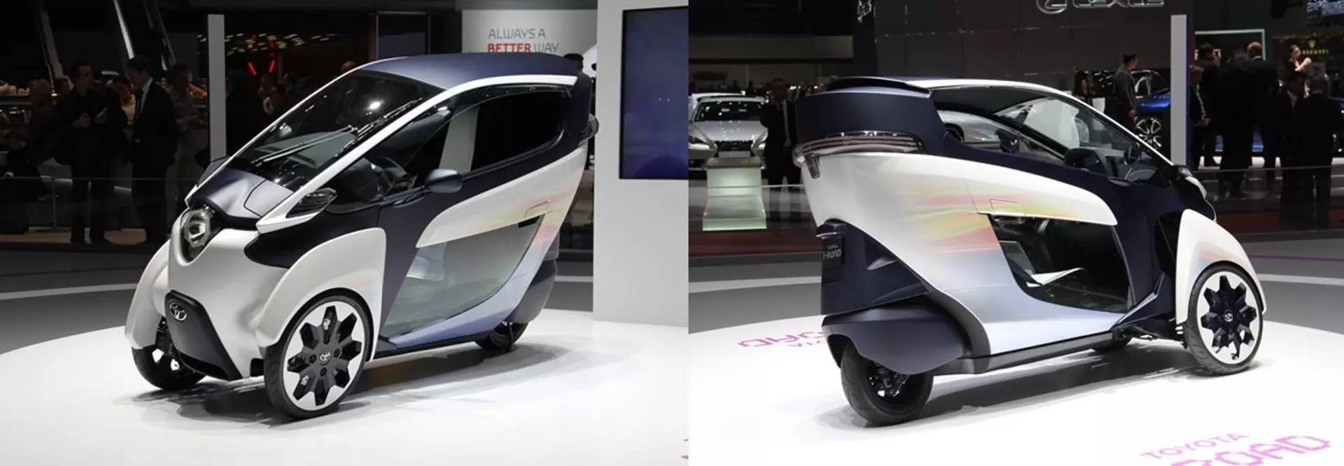 丰田于2013年在日内瓦车展上首次推出了一款全封闭、三轮两座、纯电动的概念车型—i-ROAD。这款小型电动车全长2.35米、宽0.85米,高1.44米,长宽都只有丰田普锐斯的一半左右。它的最大特点是自动倾斜技术,驾驶员无需倾倒身体来保持车辆平衡。