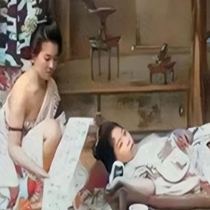 两名日本艺伎刚刚接待完客人,此时一人正在整理房间,一人正躺在地上休息