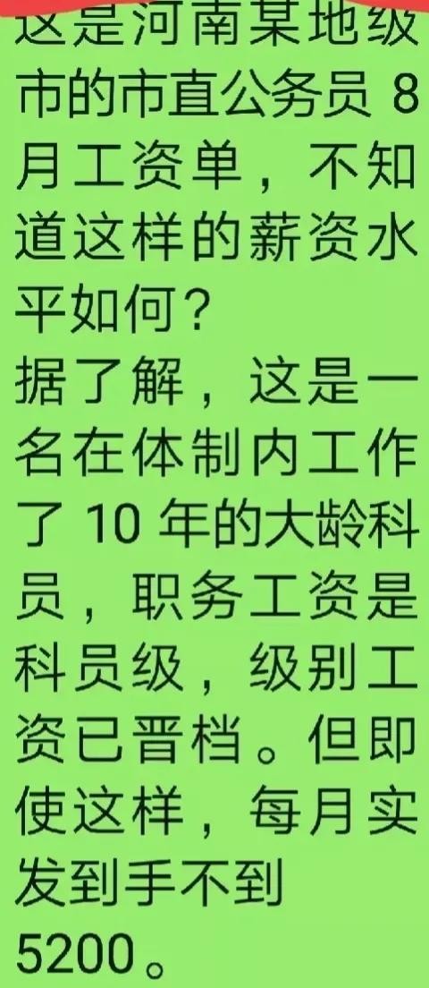 听起来十分威武的市直公务员,听起来每个月到手的,可支配工资才5200元左右,真的是穷得稳定。不过,也许这收入在河南该市已经属于中等水平了。