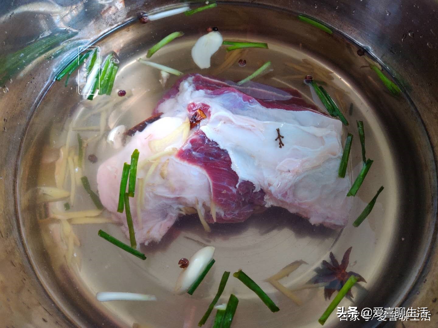 第一步 浸泡腌制,把牛肉洗净,浸泡在清水中,期间间隔半小时换一次水,浸泡至牛肉发白,差不多一个小时左右。食盐3勺,香葱一把,老姜一块,料酒2勺,花椒少许,八角一个,桂皮一块,香叶1张,大蒜2瓣。给它来个全身按摩。腌制2个小时。这一步很重要,一定要加入足够的盐才能入味。