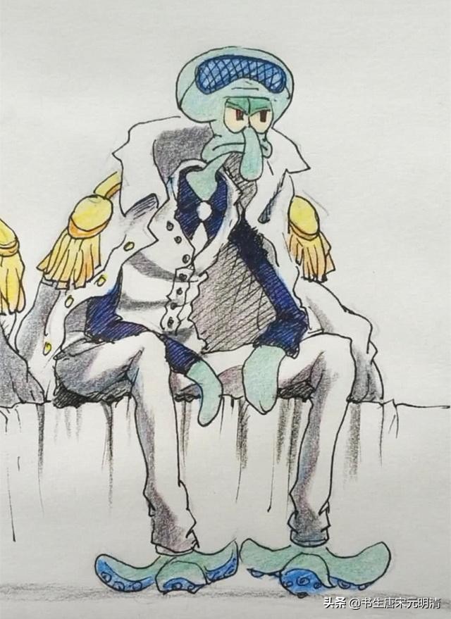 相比海绵宝宝和派大星,章鱼哥这个人的逻辑思维算是比较正常一点的,三大将中也是青雉比较正常一点,所以这个角色还是比较适合章鱼哥的,本来就比较严肃的章鱼哥穿上海军的衣服还是有点帅气的,这双手搭在腿上,并不像赤犬他们一样嚣张,章鱼哥坐的姿势非常成熟稳重。