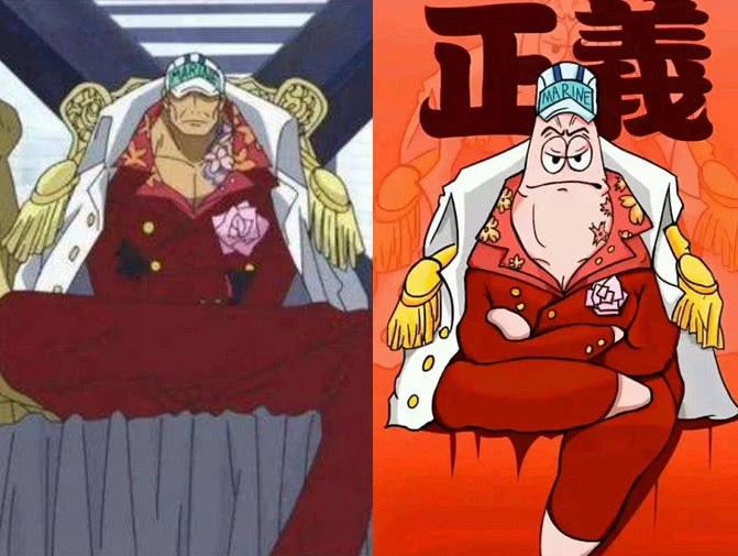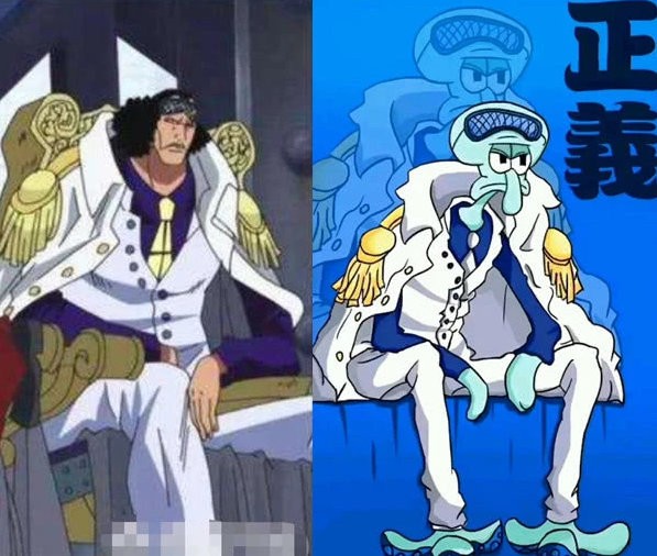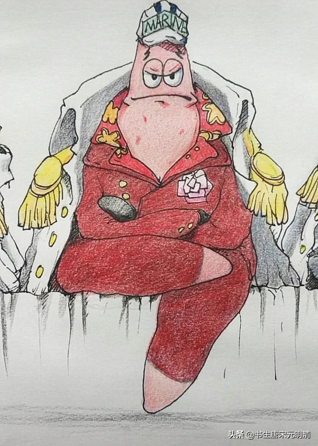 大将赤犬是岩浆果实能力者,战斗力超强,而且他个性残暴对待敌人毫不手软。上面这位派大星版的赤犬颜色倒是挺配,这小腿翘的倒是有模有样,但派大星这个人物大家都知道的,就是一个“二傻子”在“海绵宝宝”中经常做出一些奇怪的事情,这画风一改给人一种巨大的反差萌感觉。