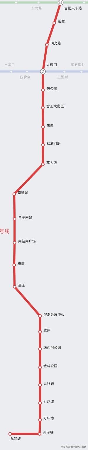 合肥轨道交通1号线,北起张洼站,南至九联圩站,呈南北走向,途径瑶海区和包河区