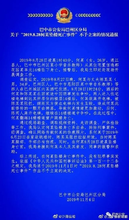 《情况通报》表明:女教师何某坠楼身亡是自杀,排除刑事案件。并依据《刑法》第一百一十二条之规定,对该事件作出不予立案的决定。