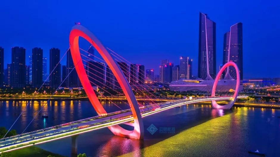 南京眼在河西新城青奥轴线中轴,是长江上首座观光步行桥,羽翼般斜拉的钢索振翅向上就像竖琴的琴弦,行人穿行其间犹如琴弦上跳跃的音符。