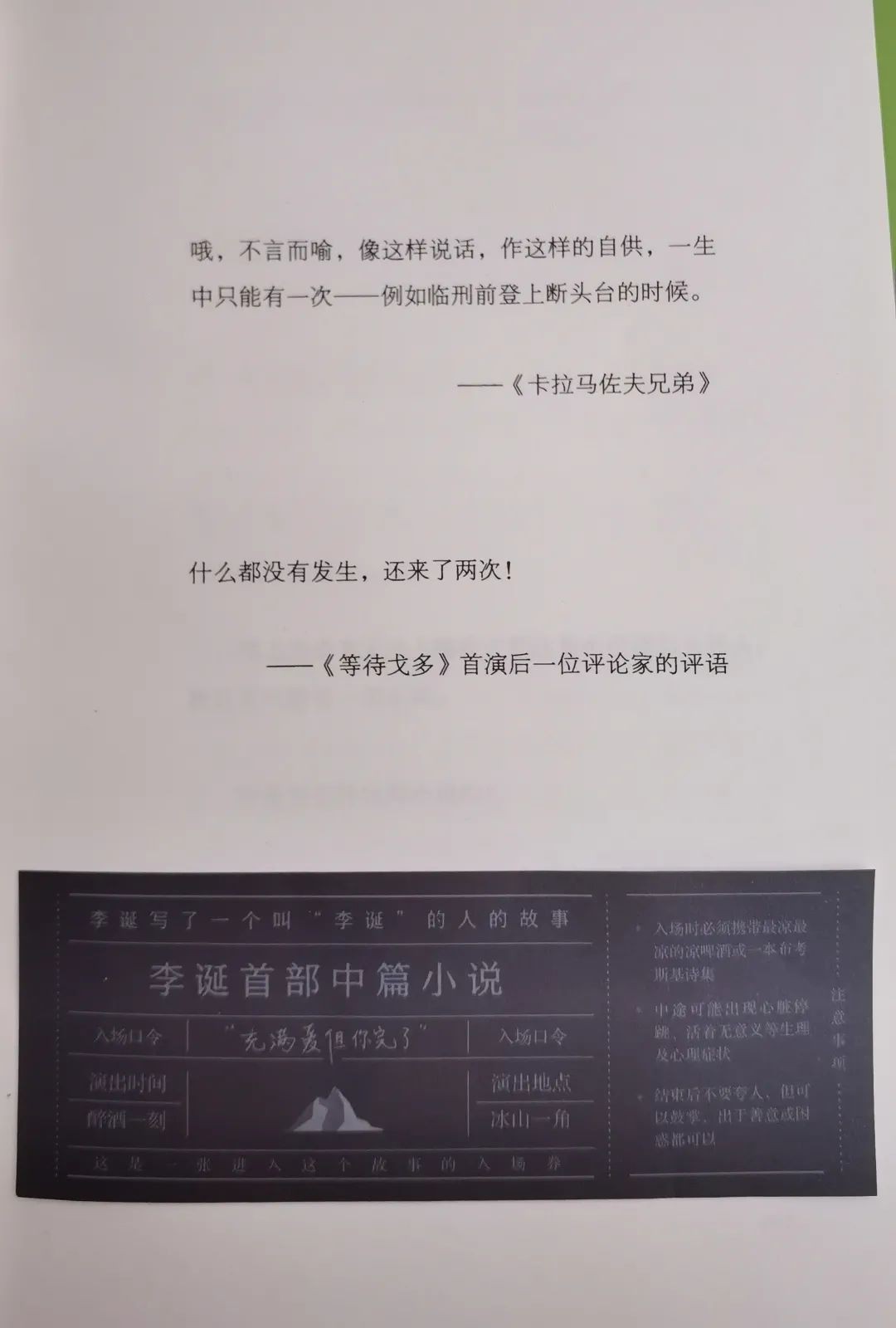 《脱口秀大会》和《奇葩说》,最近一不小心就被李诞最新创作的小说《候场》种了草。火速买了一本却迟迟没有翻开。有一天刷抖音时,这书又一次被一个很喜欢的推书Up主提及,她用清透温润的嗓音说,最近读到一句比“人间不值得”更丧的话——“我配得上死亡,你们不配我活着。”“如果你正在困境中,迷惘、痛苦、‘不舒服’,会思考人活着的意义是什么这种问题,推荐一看。因为你说不出来的话,形容不清的感觉,别人理解不了的心情,李诞都写在里边了。”听她这么一说,我被勾起了想看看这句话到底在哪儿的欲望。