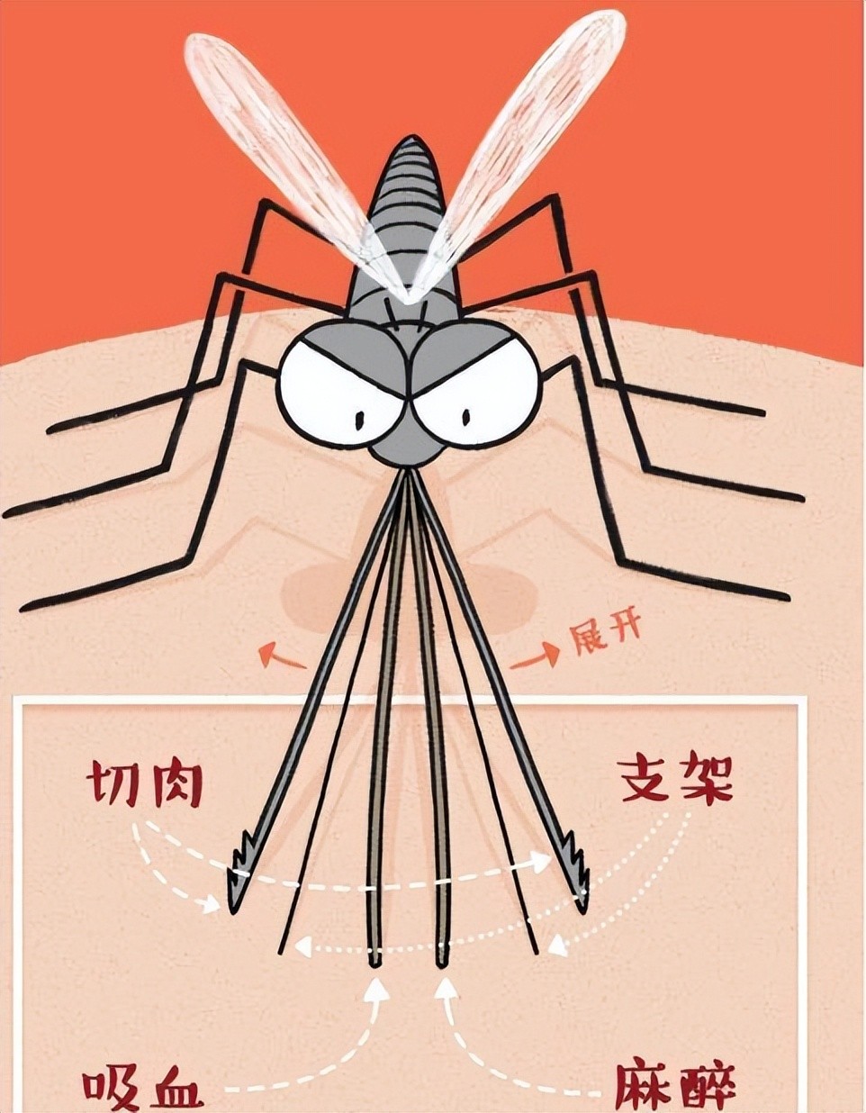 不管是哪种蚊子,嘴巴其实都是由六根细长的针管组成,当他发现你时,首先会平稳地降落在你的皮肤上,然后先给你来一口八二年的老痰,让你失去疼痛感,紧接着用六根针管中的前边两根熟练的划开你的皮肤,后面两根则负责清除寻找血管时的障碍,仅用大约20秒的时间就可以找到你的血管,如果你发现一只蚊子停留在你的皮肤上迟迟没有吸血,那多半是个业务还不熟练的新手!
