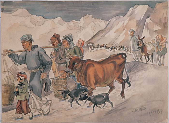 为了驱除"年″,在腊月三十,一大早,太白金星就装扮成乞讨的老人,来到了莲花村,看到村民,正在收拾东西,抚老携幼,匆匆忙忙想法躲避"年″的伤害。