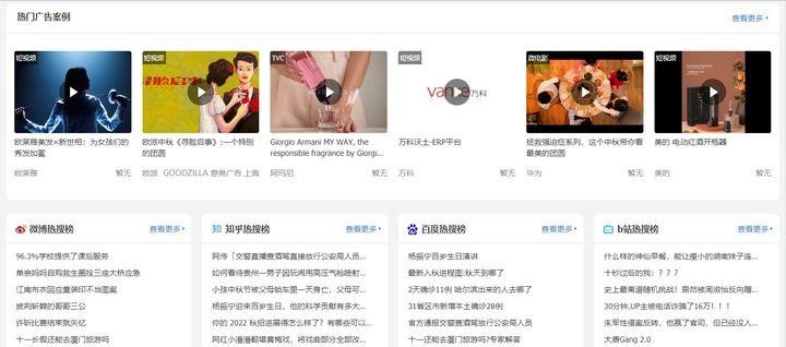 包含的内容有:热门案例、实时热点、业内资讯、媒体平台、广告案例、广告奖项、创意短片、创意文案、国潮文创、设计参考、H5参考、热榜指数、数据洞察、效率工具、方案模板、团队协同、创意热店、求职招聘、创造生意、营销大学、广告书籍,共22个分类。