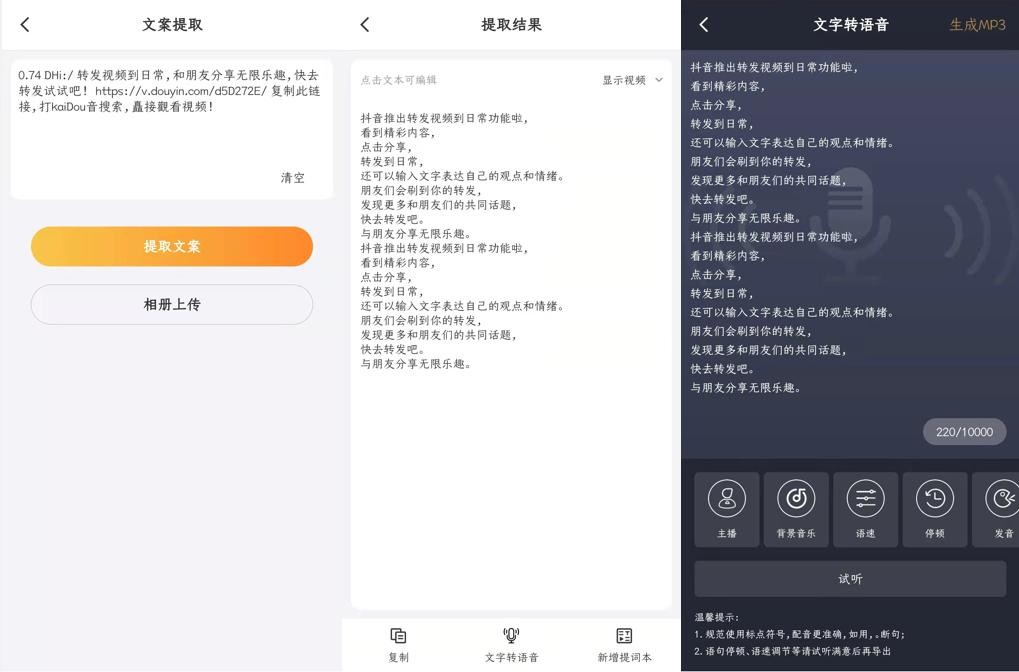 只用复制别人的视频链接,它就会自动把视频文案提取出来,提取的文案,还可以同时生成配音文件。