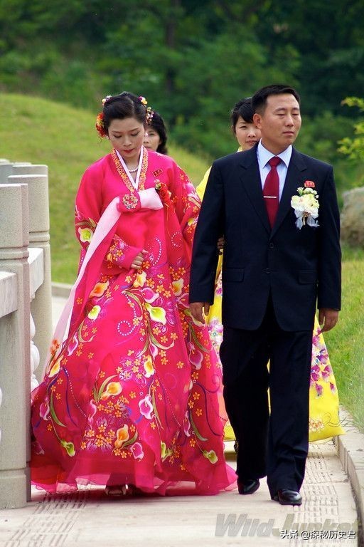 朝鲜一对新婚的夫妇,男人身材西装、领带、皮鞋,新娘是一身传统的朝鲜服装,好看极了,而且女性也喜欢穿红色的,看起来很喜庆。