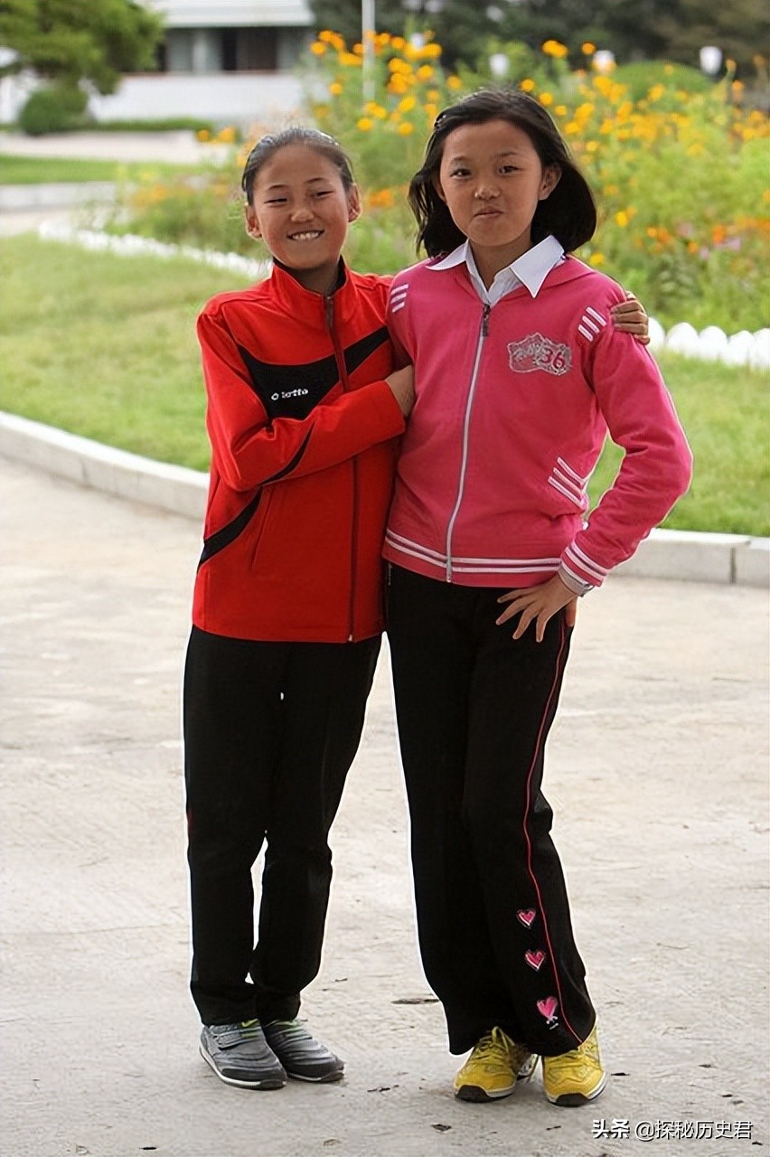 朝鲜街头两个十几岁的小女孩,都是运动装运动鞋,看来运动装在朝鲜比较流行。