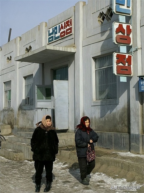 冬日的朝鲜,一对母女走在街头,老年人头上戴了一个头巾,这种头巾和我国北方农村很是相像,她的女儿穿着相对时尚,头戴围巾,脚上一双皮鞋,感觉这像我国90年代时期的装扮相似。