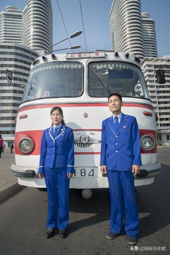 朝鲜的两个公交车司机,朝鲜的公交车,看起来相对老旧,估计应该年代久远,公交车也是普通大众的主要交通工具。
