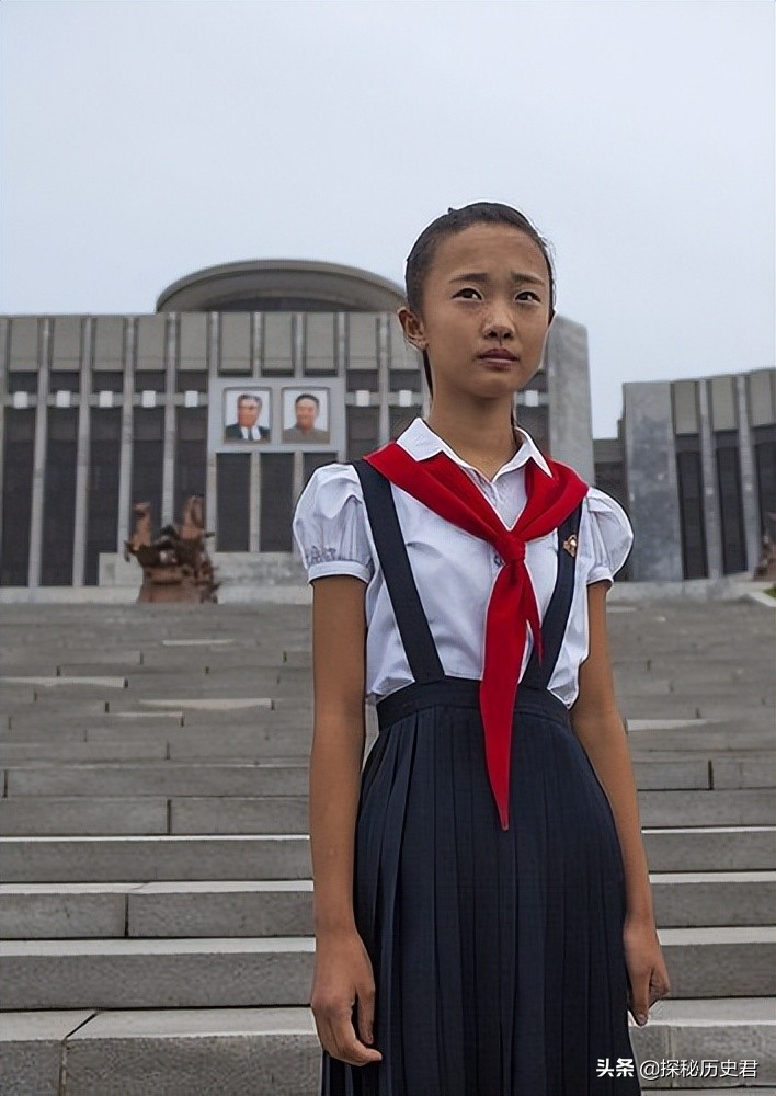 朝鲜万景台学宫前的一个小学生,穿着学校的校服,戴着红领巾,这如果走在中国的街头,和我们的小学生基本上看不出任何区别,如果真的是区别的话,一般他们会佩戴领袖的像章。