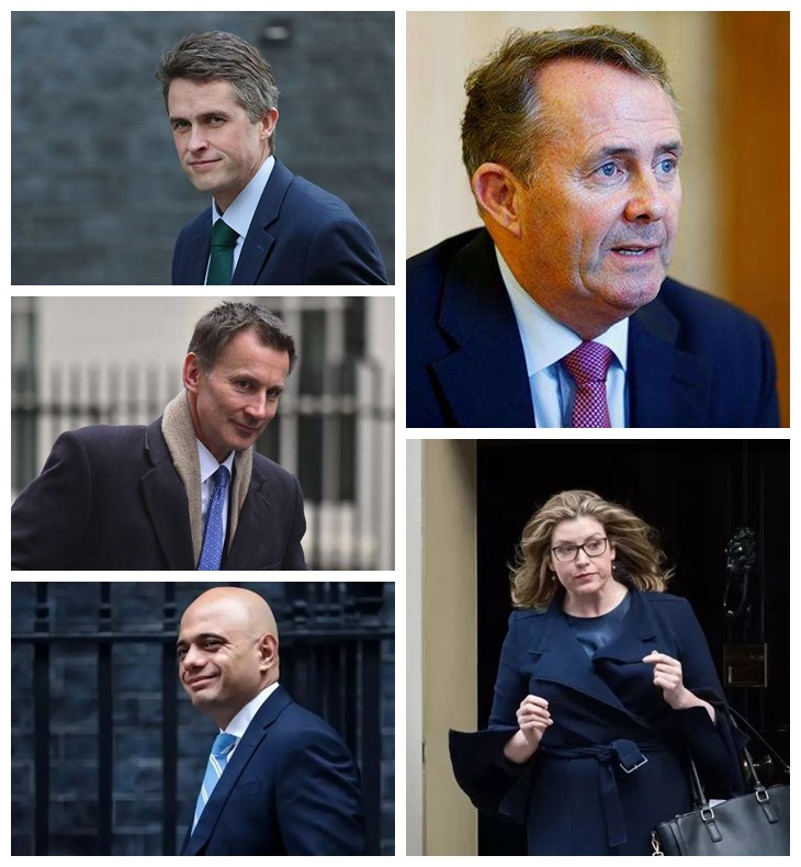 左侧从上到下:国防大臣威廉姆森、外交大臣亨特、内政大臣贾维德;右侧从上到下:国际贸易大臣福克斯、国际发展大臣莫当特。据报道,莫当特将出任国防大臣,成为英国首位女性国防大臣。