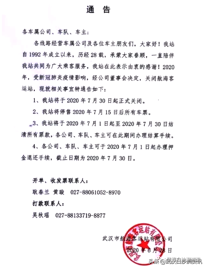 武汉白沙洲资讯从武汉市航海客运站有限公司获悉:日前,武汉市航海客运站发布通告,因为疫情的影响,公司决定将于2020年7月30日起正式关闭车站,现在将停售2020年7月15日后所有车票。
