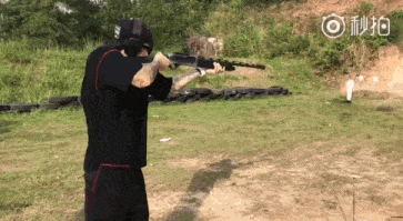 接着,扭头向镜头将枪瞄准镜头的远处。