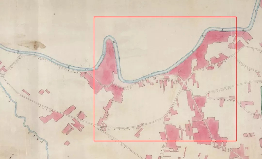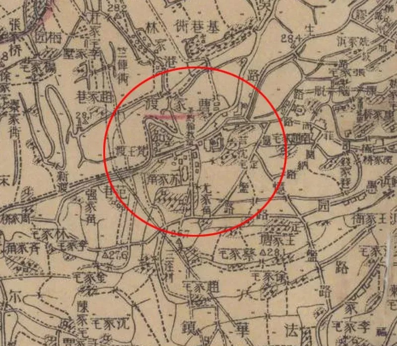 1902年绘制的曹家渡地区——红色区域为居民点(村落)