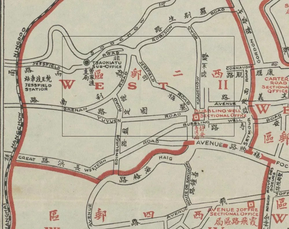 除公交车外,煤气、电灯、邮政等近代公用事业,菜场、救火会等基础设施和机构陆续设点曹家渡。1908年曹家渡出现了最初的邮政业务。1914年全国邮政建置调整,“分全国为二十一邮区,每设管理局一所,次为支局,次为代理支局。上海一埠自为一区,设管理局,并设9个支局,其中曹家渡有一处支局。