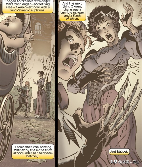 一次,小约翰发现了母亲伊丽莎白和园丁托马斯.罗根偷情,小约翰质问自己的母亲,在争吵中,小约翰能力觉醒,用骨爪划伤了伊丽莎白。