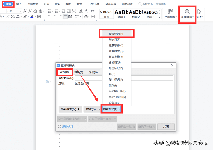 点击“开始”,选择“查找替代”,在弹出的对话框里,点击“特殊格式”里的“段落标记”。