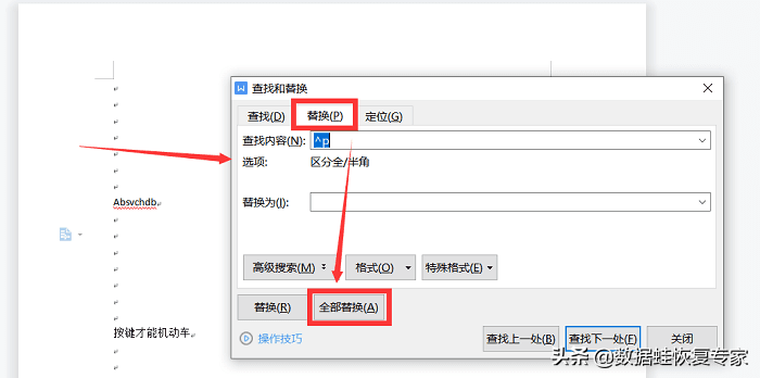切换到“替换”,然后点击“全部替换”。