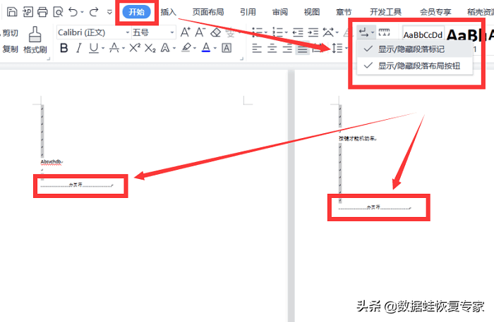 确定文档存在空白符后,在开始栏,点击下图的标志,选择“显示/隐藏段落标记”,文档就会出现“分页符”的标记位置,直接删除即可。