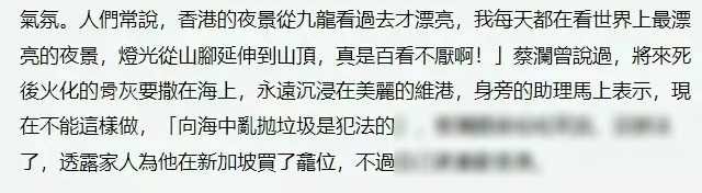 在香港的文化舞台上,蔡澜独树一帜。他坦然面对生命的终极归宿,早已为自己规划好未来的归宿。他希望能与心爱的维多利亚港融为一体,但现实的限制让他选择了另一种落叶归根的方式。在新加坡,他找到了内心的安宁与归宿。