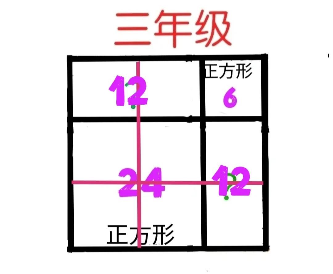 故2个小长方形的长恰为右上小正方形边长的2倍、且均可成2个部分,面积为2×6=12,从而大正方形面积为12×2+6+24=54。
