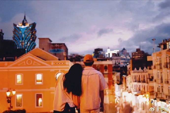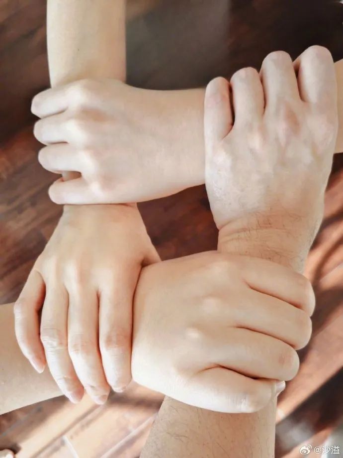 沙溢晒出的照片中,一张是夫妻俩甜蜜依偎的背影照,还有一家四口握手臂的照片。