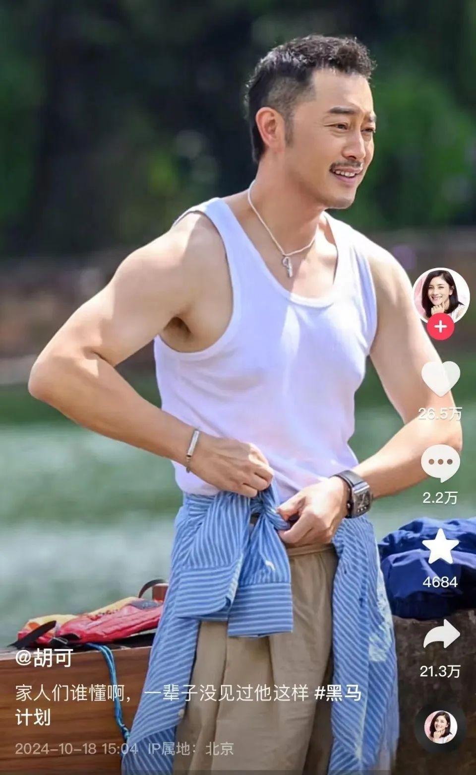 10月18日,沙溢晒出穿背心秀肌肉的照片。