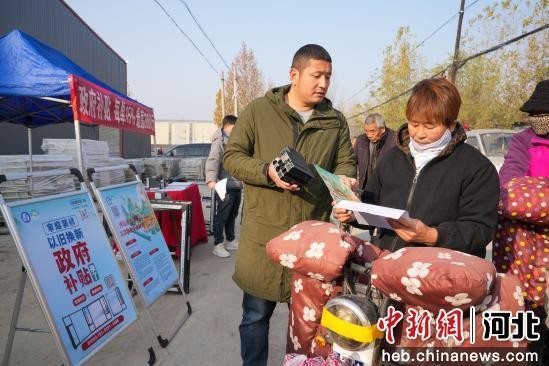 中新网河北新闻11月26日电 (尹航)25日上午,在河北省沧州任丘市永丰路街道一广场,工作人员正在为群众介绍以旧换新政策。