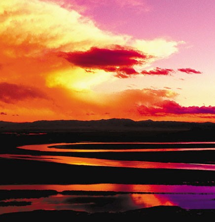日落时出现的火烧云,映红了天空,也映红了九曲黄河,黄河原来是如此绚丽多彩。