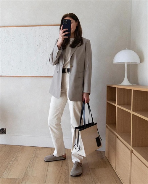 浅米色西装真的很温柔,与白色裤子搭配出迷人味道。即使是冷色调也能穿出有亲和力的感觉。