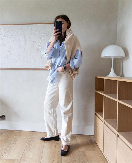 而很清新明亮的搭配,是浅蓝色衬衣配亮白长裤,在微凉的天气简单搭件米色毛衫,选对了基础款衣服,随便一搭也能美得显贵高级。