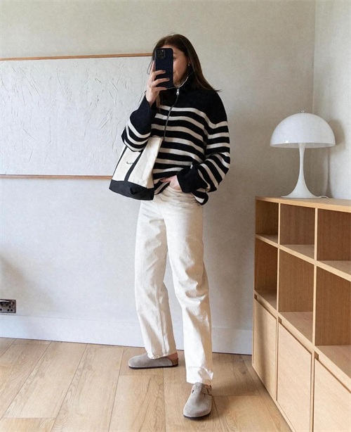 条纹衫绝对是今年我力推的款式,只是换一下颜色,就能与白色长裤穿出很高级自然的风格,可以说是很实用的搭配了。