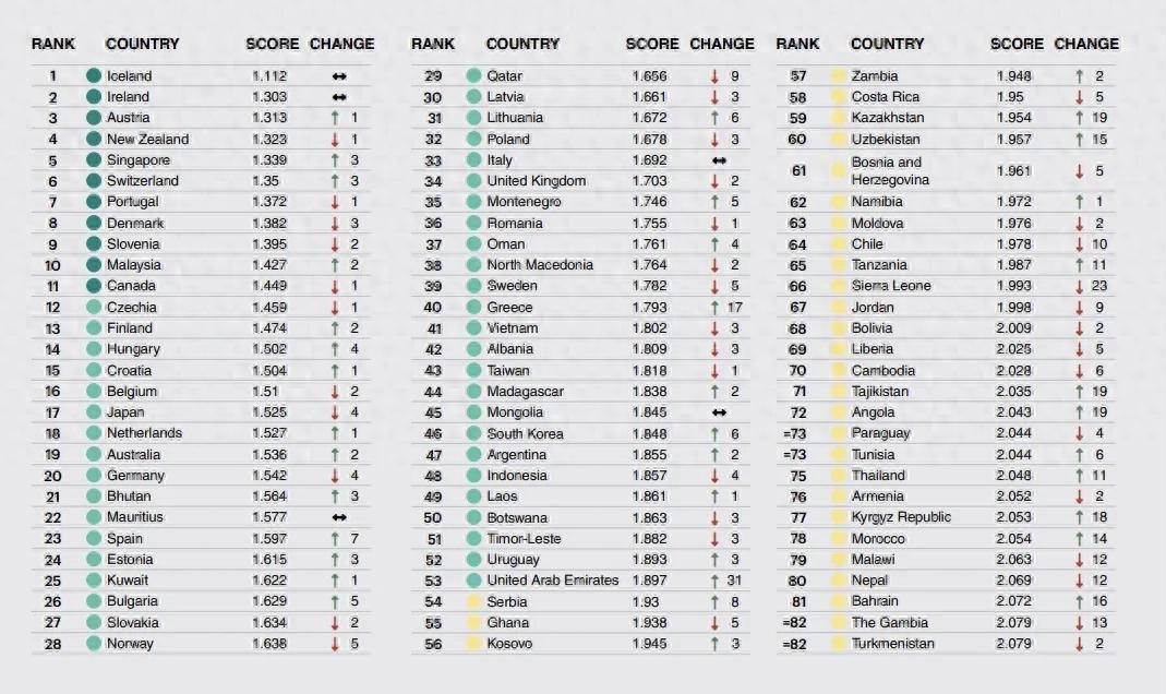 根据国际智库经济与和平研究所(IEP)公司发布的2024年全球和平指数(Global Peace Index,GPI)报告,中国在全球和平指数排名中位列第88位,与去年相比下降了6位。这一排名反映了中国在全球和平状况中的位置,同时也揭示了全球和平水平的微妙变化。