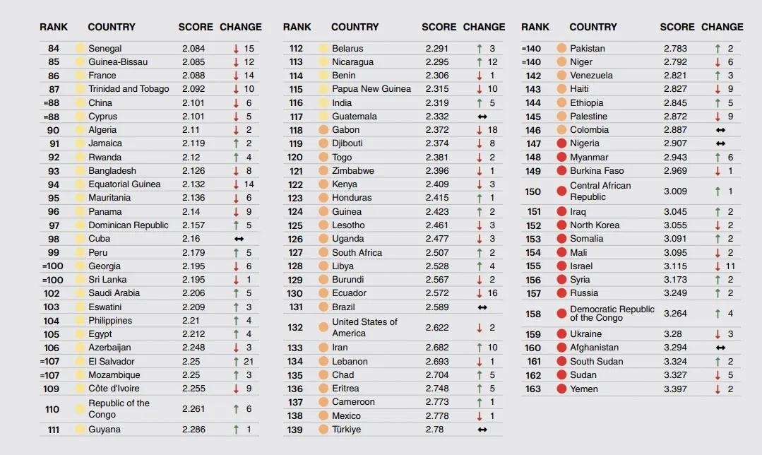 2024年的报告显示,全球平均和平水平下降了0.56%,表明全球范围内的和平状况有所恶化。在这份报告中,中国得分为2.101,较去年有所下降。这一变化可能与国内外多种因素相关,包括地缘政治紧张、经济波动等。尽管如此,中国在全球和平指数中的表现仍然显示出其在维护国内稳定和国际和平方面的努力。