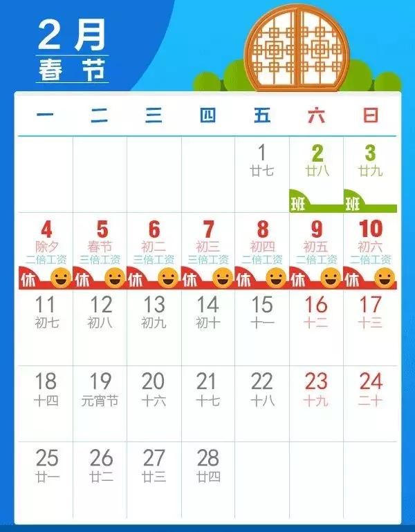 二、春节:2月4日至10日放假调休,共7天。2月2日(星期六)、2月3日(星期日)上班。