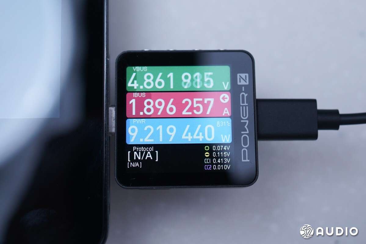 在充电方面,我爱音频网采用专业测试仪CHARGERLAB POWER-Z对智能可视主机进行充电测试,测得该智能可视主机的有线充电电压电流约为4.86V 1.89A,功率约为9.21W。