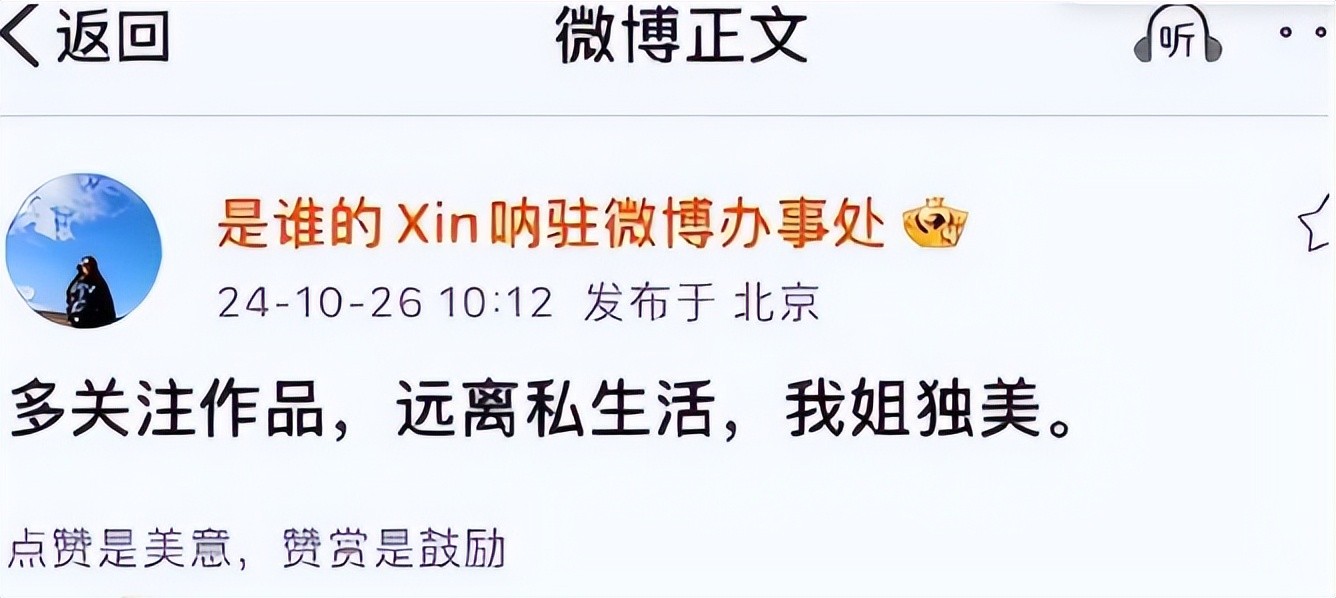 而辛芷蕾的助理发文说“多关注作品,远离私生活,我姐独美”。
