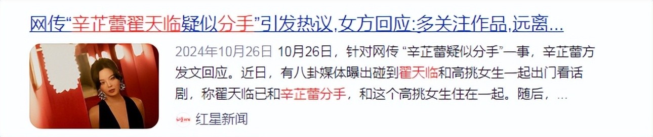 消息来源:2024年10月26日一红星新闻一网传“辛芷蕾翟天临疑似分手”引发热议,女方回应:多关注作品,远离私生活,我姐独美