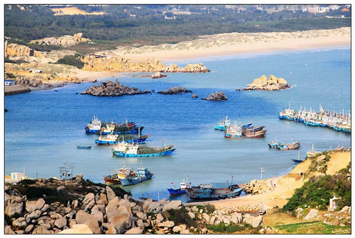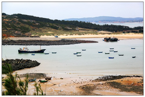 站在将军山上俯瞰下面的港湾,停泊了许多渔船。